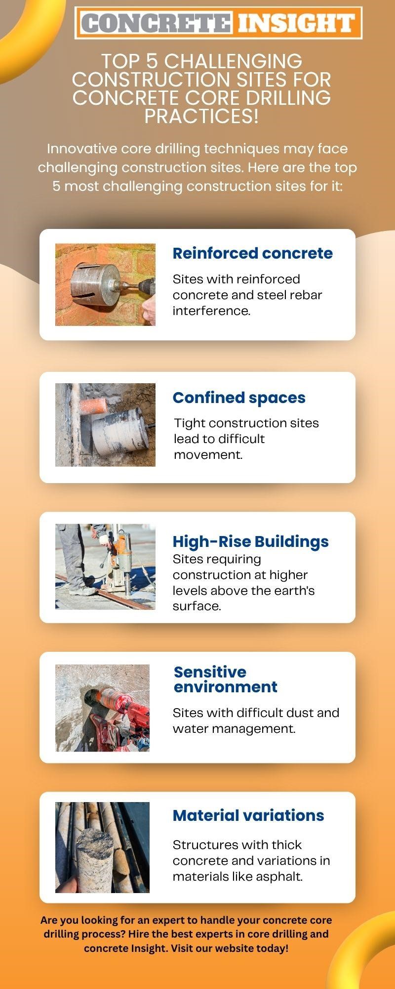 Sites like tight spaces, high-rise buildings, and reinforced concrete and steel rebar are the most challenging sites when it comes to concrete core drilling.