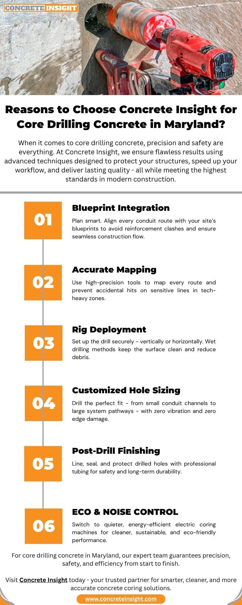 If you're handling a job in the DMV region and want skilled help for top-notch core drilling concrete, reaching out to an experienced core drilling company Maryland can be a game-changer. Check in with experts like those at Concrete Insight we offer deep knowledge and support your plan. What's your next coring task? Let's tackle it head-on.